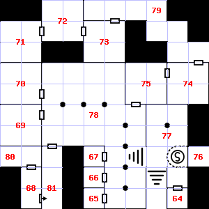 | 64 | A strong wind blows through this area. There is a pick handle here. | 65 | Encounter: Skeletons (12) Treasure: None. | 66 | This area has a stale, fetid smell. There is a mold growing here. |
