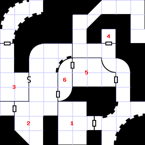 | 1 | This area is covered in cobwebs. Encounter: Skeletons (4) Treasure: None. | 2 | There is a putrid smell coming from something nearby. There is water dripping here. Encounter: Skeletons (9) Treasure: As per monster type. | 3 | This area is covered in cobwebs. Treasure: 200sp. Trap: Illusion of monsters: Shrews, Giant (9) |