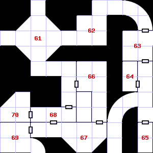 | 67 | A slight breeze blows through this area. Fog gathers and swirls on the floor, concealing it. There is a pile of rags here. Treasure: 600sp. | 68 | A cold air current blows through this area. | 69 | A strong, moaning wind blows through this area. |