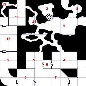 | 13 | 14 | A slight, damp breeze blows through this area. | 15 | A strong wind blows through this area. This area has a stale, fetid smell. Trap: Chute: No damage, but slide to the next level down (ignore if there is no lower level). | |
