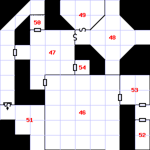 | 46 | Encounter: Stirges (6) Treasure: None. | 47 | A gusting breeze blows through this area. This area smells faintly of urine. It is foggy here, making it difficult to see. Trap: Fog: Looks like poison gas, but harmless. | 48 | It is foggy here, making it difficult to see. |