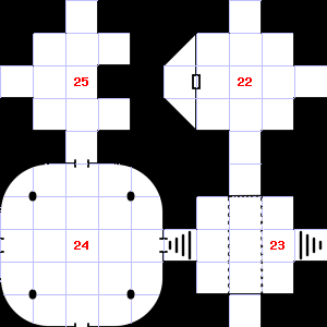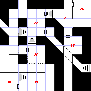 | 22 | It is foggy here, making it difficult to see. | 23 | There is a broken pole here. Encounter: Lizards, Gecko (2) Treasure: None. | 24 | There is water dripping here. Treasure: 200sp. Trap: Illusion of monsters: Snakes, Cobra (5) |
