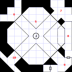 | 4 | A haze of smoke hangs in the air. There are cracks in the wall here. | 5 | There are cracks in the ceiling here. Encounter: Stirges (9) Treasure: None. | 6 | There is a broken arrow here. |