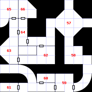 | 64 | There is a pile of rags here. | 65 | A metallic smell assails your nostrils. It is foggy here, making it difficult to see. | 66 | There are rotting wood pieces here. |