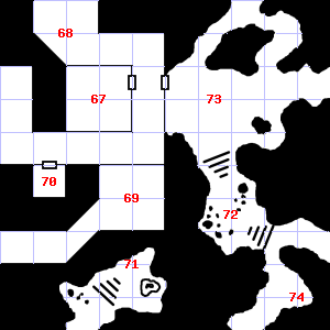 | 70 | A gusting breeze blows through this area. Treasure: 400sp. Trap: Flash of light: Save vs. Spells or be blinded for 1d8 turns (1d8x10 minutes). | 71 | A strong, moaning wind blows through this area. | 72 | This area is covered in cobwebs. Encounter: Shrews, Giant (2) Treasure: None. |