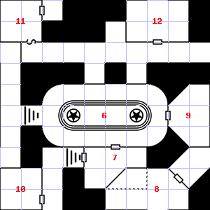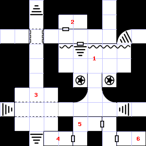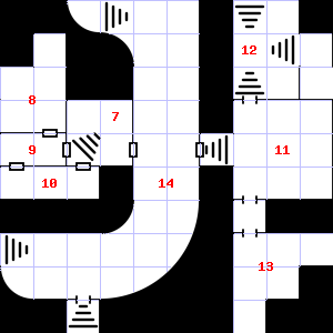 | 16 | A strong downdraft blows through this area. This area is covered in cobwebs. Trap: Poison gas: Save vs. Poison or die. | 17 | The air here is very hot. | 18 | This area smells faintly of urine. There are rotting wood pieces here. |