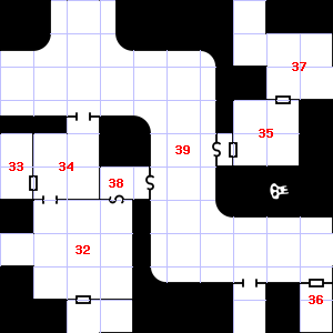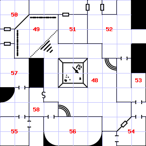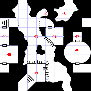 | 40 | A cold air current blows through this area. This area is very dusty. Treasure: 100sp. | 41 | This area smells faintly of urine. It is foggy here, making it difficult to see. The wall here is damp. | 42 | There is a large puddle of water here. |