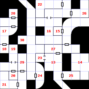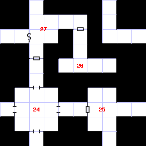 | 25 | This area is covered in cobwebs. | 26 | There is a putrid smell coming from something nearby. The wall here is damp. Treasure: 100sp, 30gp. | 27 | This area has a pleasant, earthy smell. |
