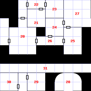 | 19 | The air here is very hot. Treasure: 500sp. | 20 | 21 | A slight breeze blows through this area. Treasure: 200sp. Trap: Poison snake: 1 hit dice. | |