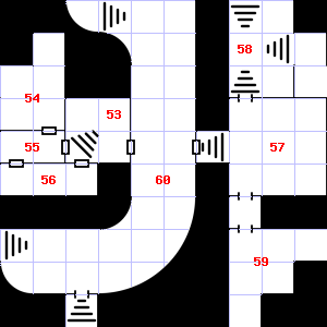 | 55 | A slight breeze blows through this area. This area smells faintly of manure. There is a torn leather boot here. | 56 | A slight downdraft blows through this area. There is a mold growing here. Treasure: 300sp, 60gp. | 57 | A slight breeze blows through this area. There is a pile of ashes here. |