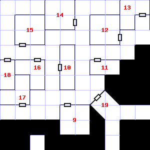 | 16 | Encounter: Kobolds (11) Treasure: None. | 17 | The air here is very cold. There are cracks in the floor here. Treasure: 200sp. | 18 | Encounter: Snakes, Cobra (5) Treasure: As per monster type. |