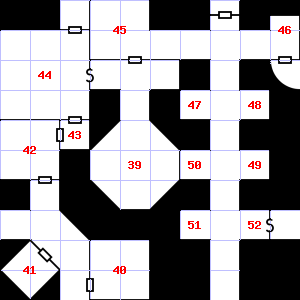 | 43 | Treasure: 300sp, 1 gems. | 44 | Encounter: Green Slimes (3) Treasure: None. | 45 | A slight updraft blows through this area. There is a slimy coating on the floor here. |