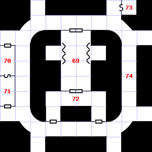 | 73 | This area has a stale, fetid smell. Treasure: 400sp, 20gp. Trap: Poison snake: 1 hit dice. | 74 | A slight, damp breeze blows through this area. There is a mold growing here. Encounter: Gnomes (5) Treasure: As per monster type. |
