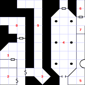 | 7 | There is a blunt javelin head here. Trap: Fog: Looks like poison gas, but harmless. | 8 | There is a putrid smell coming from something nearby. This area is covered in cobwebs. Encounter: Dwarves (1) Treasure: None. | 9 | This area is covered in cobwebs. Encounter: Goblins (5) Treasure: None. |