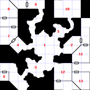 | 13 | It is foggy here, making it difficult to see. This area is very dusty. Treasure: 100sp, 10gp. Trap: Illusion of monsters: Halflings (10) | 14 | There are cracks in the wall here. | 15 | |