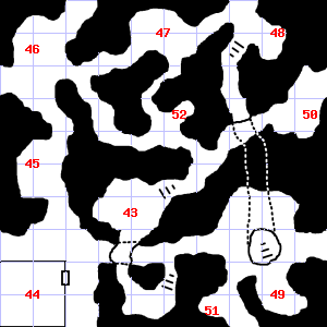| 46 | A strong wind blows through this area. This area has a pleasant, earthy smell. | 47 | A slight breeze blows through this area. There are several small stones here. | 48 | It is foggy here, making it difficult to see. This area is covered in cobwebs. |