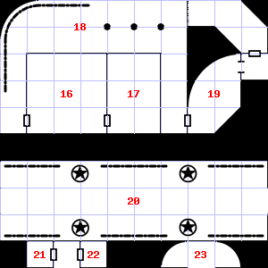| 13 | Encounter: Halflings (15) Treasure: None. | 14 | This area smells faintly of manure. Encounter: Goblins (7) Treasure: None. | 15 | A slight, damp breeze blows through this area. There are cracks in the ceiling here. |