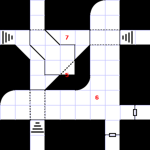 | 31 | 32 | There is a broken pole here. | 33 | There is a bent and rusted iron bar here. Trap: 10' Pit: 1d6 points of damage if you fall in. | |