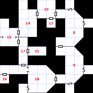 | 16 | A strong, moaning wind blows through this area. There is a mold growing here. | 17 | An acrid smell assails your nostrils. This area is very dusty. | 18 | There are wax drippings here. |