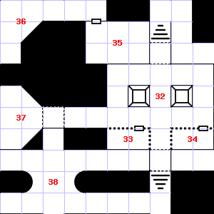 | 31 | The air here smells of smoke. | 32 | Treasure: 600sp, 10gp. Trap: Poison needle: Save vs. Poison or die. | 33 | This area is covered in cobwebs. |
