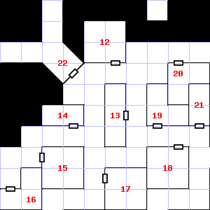 | 13 | Your nostrils are overwhelmed by a sulphurous smell. Teeth and fangs are scattered here. Encounter: Green Slimes (1) Treasure: As per monster type. | 14 | A cold air current blows through this area. The smell of ozone assails your nostrils. There is a broken sword blade here. | 15 | Fog gathers and swirls on the floor, concealing it. There is a slimy coating on the floor here. Treasure: 500sp. |