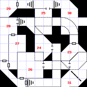 | 28 | The air here is very hot. This area smells faintly of urine. There is a torn leather boot here. Treasure: 400sp, 30gp. | 29 | The air here is very hot. This area smells faintly of manure. This area is covered in cobwebs. Treasure: 500sp, 4 gems. Trap: Spring-fired darts: 1-6 darts hit for 1-4 points of damage each. | 30 | The air here is very hot. Encounter: Green Slimes (1) Treasure: As per monster type. |