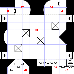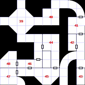 | 40 | There is water dripping here. Treasure: 100sp, 60gp. | 41 | There is water dripping here. | 42 | A strong updraft blows through this area. This area is very dusty. Encounter: Lizards, Gecko (1) Treasure: None. |