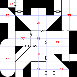 | 61 | There is a large puddle of water here. Trap: Fog: Looks like poison gas, but harmless. | 62 | This area has a stale, fetid smell. | 63 | A slight breeze blows through this area. Treasure: 200sp. |