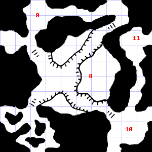 | 67 | 68 | The air here is very hot. The wall here is damp. Encounter: Traders (2) Treasure: None. | 69 | The air here is very cold. This area is covered in rubble and dirt. | |
