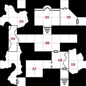 | 19 | A cold air current blows through this area. This area is covered in cobwebs. Encounter: Skeletons (7) Treasure: None. | 20 | It is foggy here, making it difficult to see. Treasure: 500sp, 20gp. Trap: Illusion of monsters: Beetles, Fire (5) | 21 | The ceiling here is damp. |
