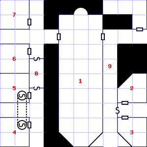 | 7 | Treasure: 200sp. | 8 | It is foggy here, making it difficult to see. Trap: Pendulum blade from ceiling: 1d8 points of damage. | 9 | There is a broken sword blade here. |