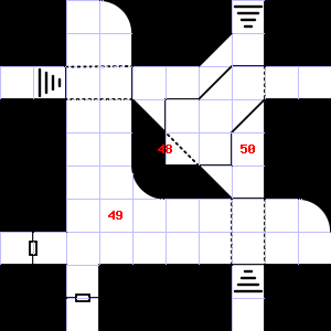 | 46 | There are cracks in the floor here. Treasure: 200sp, 10gp. Trap: Spray: Unknown liquid that attracts Wandering Monsters; double chances for 1d6 hours. | 47 | A slight downdraft blows through this area. This area has a stale, fetid smell. | 48 | This area smells of rotting vegetation. Trap: 10' Pit: 1d6 points of damage if you fall in. |