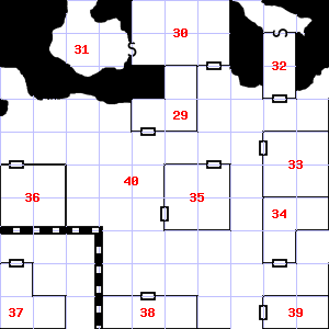 | 37 | A cold air current blows through this area. There are cracks in the floor here. Encounter: Orcs (7) Treasure: None. | 38 | The smell of ozone assails your nostrils. Encounter: Green Slimes (1) Treasure: As per monster type. | 39 | This area smells of rotting vegetation. There are cracks in the ceiling here. Encounter: Beetles, Fire (7) Treasure: As per monster type. |