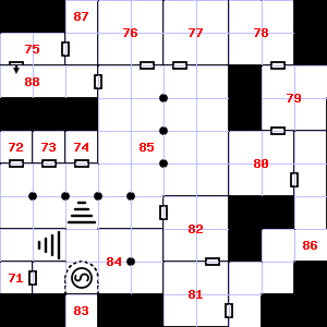 | 73 | A strong, moaning wind blows through this area. | 74 | This area smells faintly of manure. Trap: Fog: Looks like poison gas, but harmless. | 75 | The air here smells of smoke. The wall here is damp. Encounter: Sprites (10) Treasure: As per monster type. |
