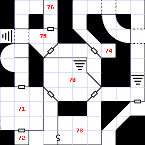 | 70 | There are dry leaves and twigs scattered here. Treasure: 300sp. | 71 | The air here is very cold. This area smells of rotting vegetation. There is a mold growing here. | 72 | Encounter: Goblins (3) Treasure: As per monster type. |