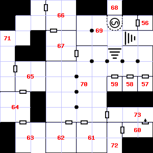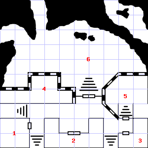 | 70 | A slight downdraft blows through this area. This area has a pleasant, earthy smell. There is a pile of dung here. Encounter: Sprites (12) Treasure: None. | 71 | A strong, moaning wind blows through this area. This area has a pleasant, earthy smell. There is a trickle of water here. | 72 | A strong, moaning wind blows through this area. Encounter: Spiders, Crab (2) Treasure: None. |