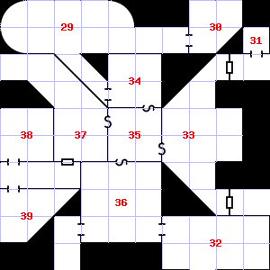 | 31 | Fog gathers and swirls on the floor, concealing it. This area is very dusty. Trap: Fog: Looks like poison gas, but harmless. | 32 | There are bones scattered here. Encounter: Spiders, Crab (4) Treasure: None. | 33 | Your nostrils are overwhelmed by a sulphurous smell. There is water dripping here. Treasure: 600sp. Trap: Illusion of monsters: Gnomes (5) |