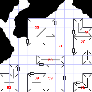 | 61 | 62 | A slight downdraft blows through this area. This area smells faintly of urine. Treasure: 600sp, 10gp. Trap: Poison needle: Save vs. Poison or die. | 63 | ||