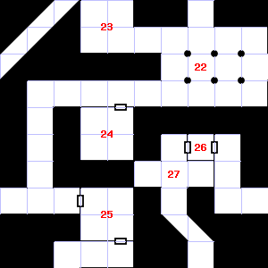 | 22 | 23 | A strong wind blows through this area. The ceiling here is damp. Encounter: Shrews, Giant (9) Treasure: As per monster type. | 24 | This area has a pleasant, earthy smell. | |