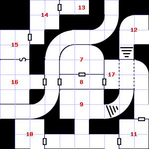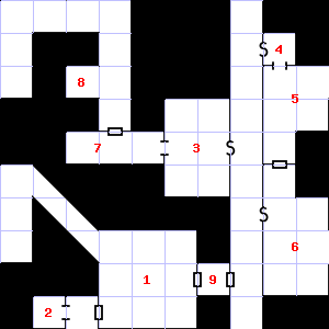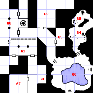 | 7 | It is foggy here, making it difficult to see. Treasure: 400sp, 60gp. Trap: Spring-fired darts: 1-6 darts hit for 1-4 points of damage each. | 8 | 9 | A cold air current blows through this area. Treasure: 500sp. | |