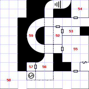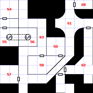 | 52 | The remnants of a rope are here, rotten. | 53 | The air here is very cold. There is a slimy coating on the wall here. Treasure: 300sp. Trap: Illusion of monsters: Skeletons (8) | 54 | The air here is very hot. Treasure: 600sp, 30gp. Trap: Poison needle: Save vs. Poison or die. |