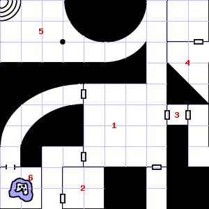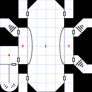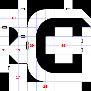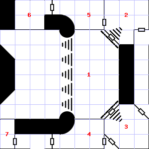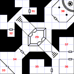 | 25 | A strong, moaning wind blows through this area. There are cracks in the floor here. Treasure: 100sp. Trap: Spring-fired darts: 1-6 darts hit for 1-4 points of damage each. | 26 | A strong downdraft blows through this area. This area smells faintly of manure. Encounter: Snakes, Cobra (3) Treasure: As per monster type. | 27 | |