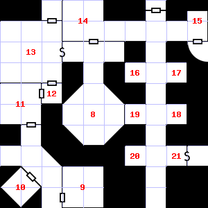 | 10 | There are scratches on the wall here. Encounter: Acolytes (4) Treasure: None. | 11 | Pottery shards are scattered here. | 12 | This area is very dusty. Encounter: Gnomes (4) Treasure: As per monster type. |