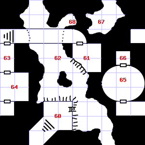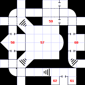 | 58 | There is a pile of straw here. | 59 | This area is covered in cobwebs. Treasure: 300sp, 5 gems. | 60 | There is a badly dented helmet here. |