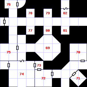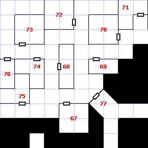 | 73 | A strong wind blows through this area. There is a pile of rags here. Encounter: Gnomes (6) Treasure: None. | 74 | This area has a stale, fetid smell. Encounter: Dwarves (6) Treasure: As per monster type. | 75 | There are rotting wood pieces here. Encounter: Spiders, Crab (2) Treasure: None. |
