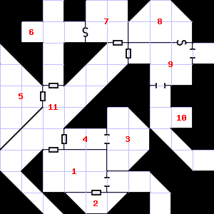 | 7 | 8 | Fog gathers and swirls on the floor, concealing it. There is a bent copper coin lying here. Encounter: Killer Bees (2) Treasure: As per monster type. | 9 | A haze of dust hangs in the air. Encounter: Lizards, Gecko (3) Treasure: None. | |