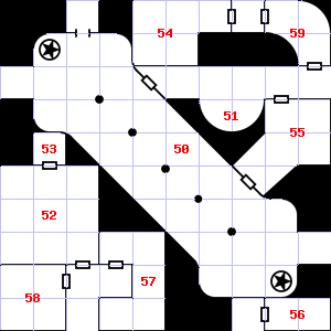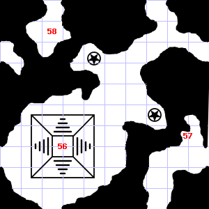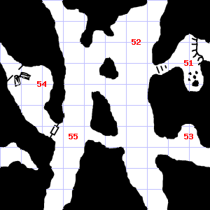 | 52 | The air here is very hot. There is a broken arrow here. | 53 | The air here is very cold. A chlorine-like smell assails your nostrils. Treasure: 400sp, 10gp. | 54 | |