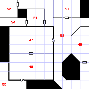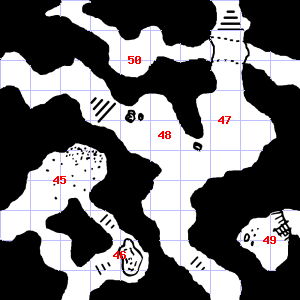 | 46 | It is foggy here, making it difficult to see. There is a torch stub here. Trap: Pendulum blade from ceiling: 1d8 points of damage. | 47 | A slight, damp breeze blows through this area. Treasure: 400sp, 50gp. | 48 | This area smells faintly of urine. |