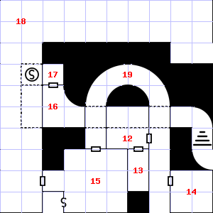 | 16 | A slight breeze blows through this area. This area has a stale, fetid smell. | 17 | There is water dripping here. Encounter: Wolves (7) Treasure: As per monster type. | 18 | A slight breeze blows through this area. Fog gathers and swirls on the floor, concealing it. There are cracks in the floor here. |