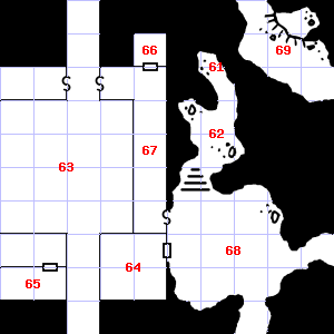 | 61 | 62 | Encounter: Lizards, Gecko (1) Treasure: As per monster type. | 63 | The air here is very hot. It is misty here. Encounter: Halflings (11) Treasure: None. | |